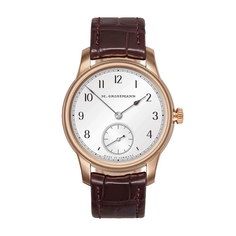 19世紀の懐中時計に由来するM.GROSSMANNロゴと、同社の誇る繊細に磨き抜かれたブラウンバイオレットの針、そしてなめらかなシルバーダイヤルによるコントラストが静謐な緊張感を生みます。