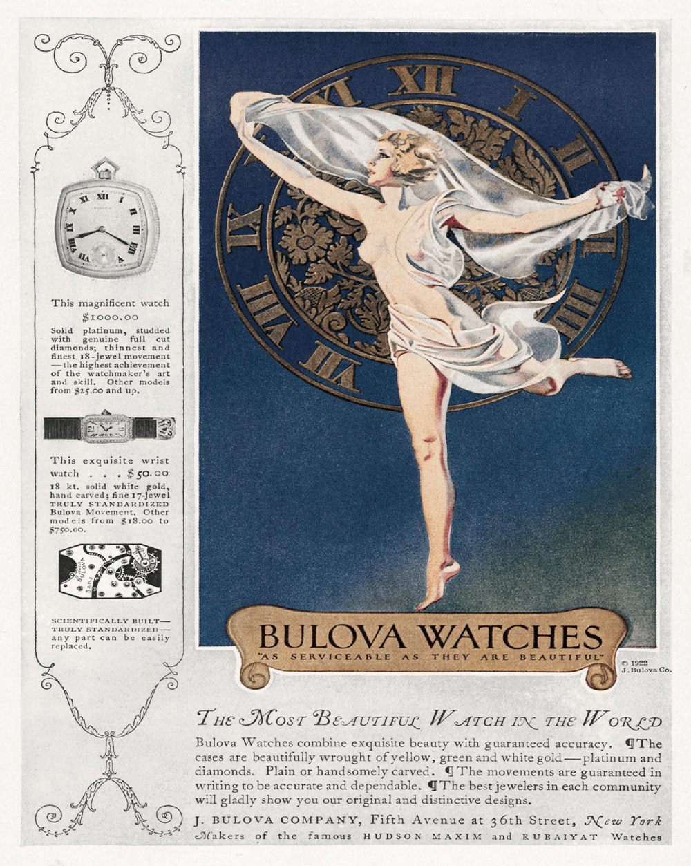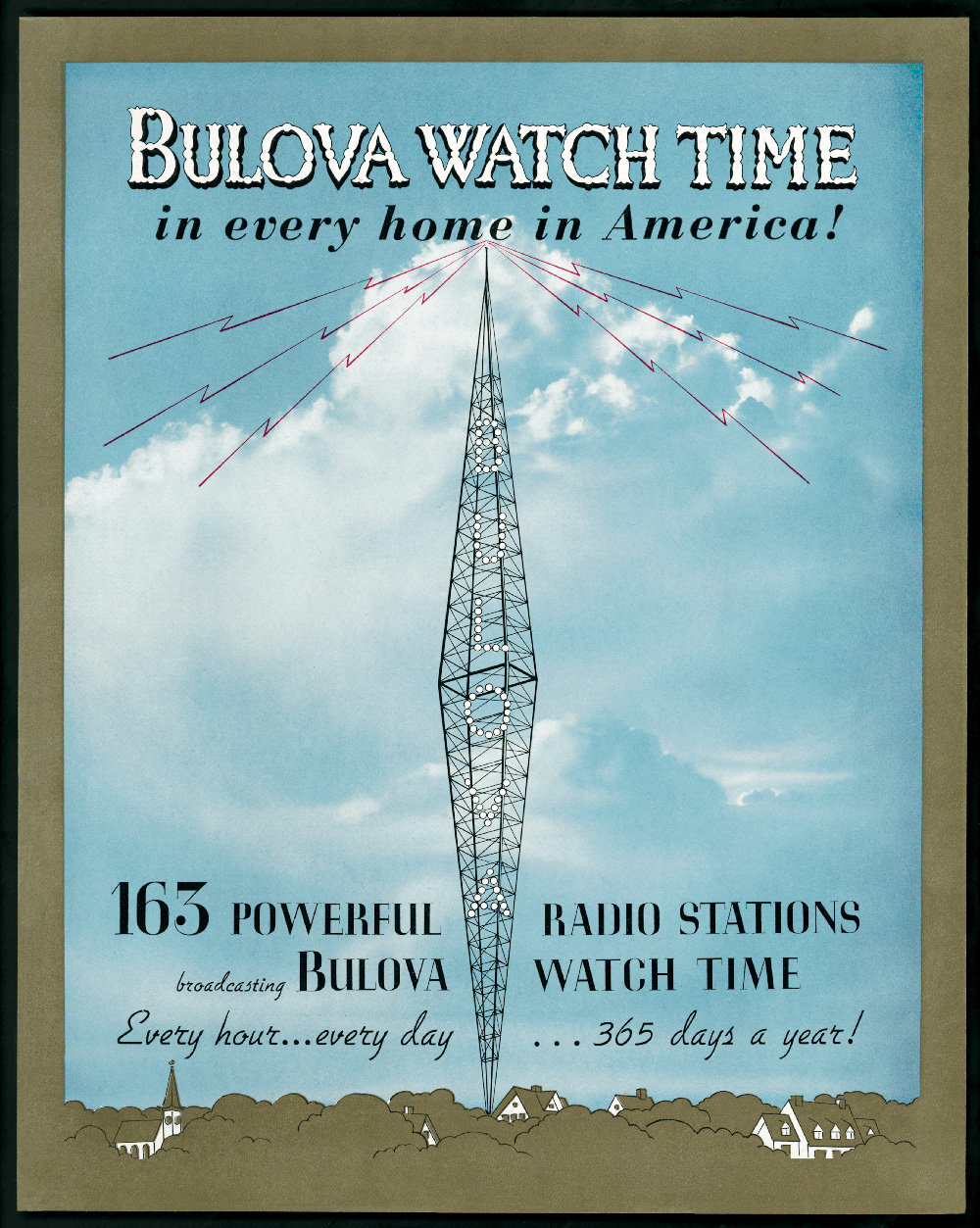 1923年には正式に「ブローバ ウォッチ カンパニー」となり、「世界一美しく、正確な時計」というキャッチコピーで、新聞、雑誌から屋外の大型広告まで大規模な広告キャンペーンを展開。1926年には「世界初のラジオ・コマーシャルのひとつ」とされる時報型広告(“At the tone, it's 8 o'clock, Bulova watch time.”)の放送を開始します。ラジオ好きの方なら「〇〇(スポンサー名や商品名)が午前(午後)△時をお知らせします」という時報広告を聴いたことがあるのではないでしょうか。ブローバはそのラジオ広告のパイオニアなのです。さらにテレビ時代になると、テレビ初の時報広告も提供しています。