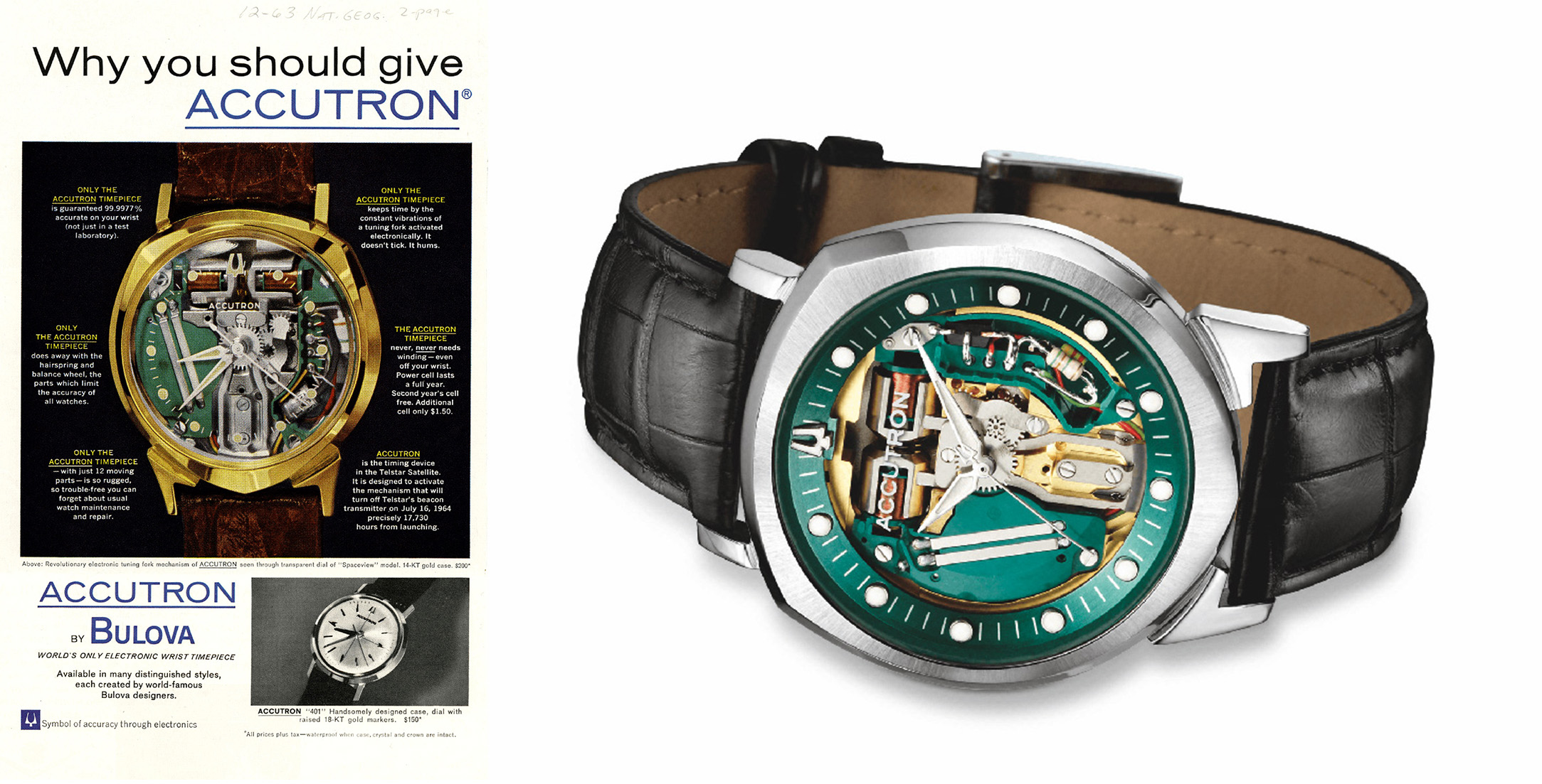 左)1960年、世界に衝撃を与えた「アキュトロン」の広告。右)2020年に発売された復刻版。