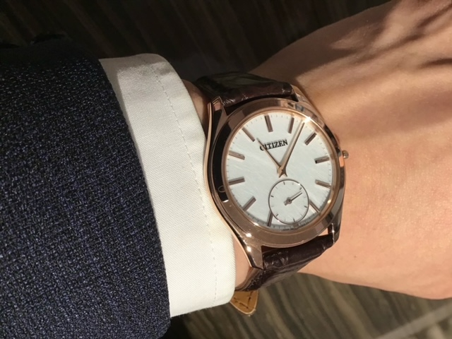 腕に通すと、その薄さと着け心地の良さに驚き、6時位置に小秒針表示があることで、実用性もあり、スーツと合わせた時の一体感は抜群です。