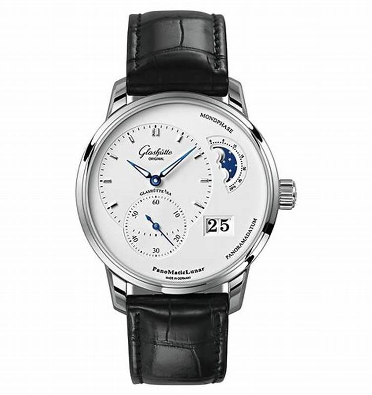 黄金比に基づいて左右非対称にレイアウトされているパノマティックルナはグラスヒュッテ・オリジナルのアイコンモデルです。