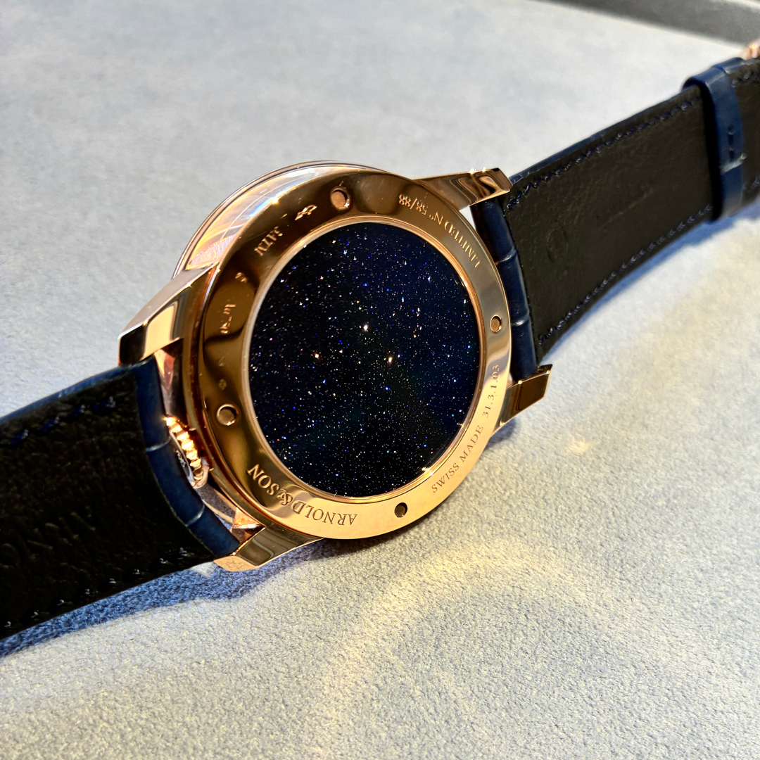 透明でもスモークでもなく、非常に薄いアベンチュリンガラスの為、時計を腕に着けていないときは光を通し、透明感と色彩を感じることができます。