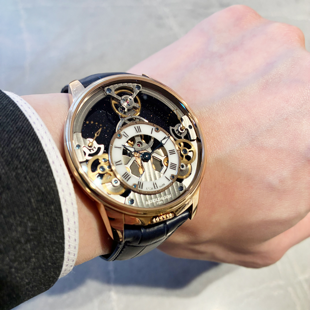 腕にのせて見た時の美しいシンメトリーのムーブメントと、腕から外して光を透して見るアベンチュリンガラスの透き通った美しさを是非実際にご覧になって見てください。